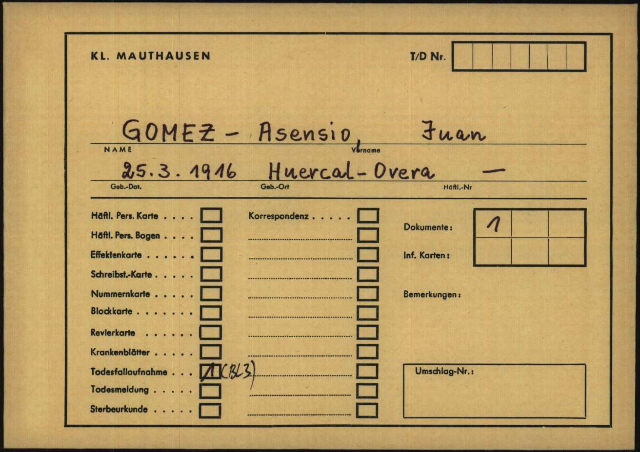 Juan Gómez Asensio va néixer el 25 de març de 1916 Huércal-Overa (Almeria). Va viure a Cerdanyola abans de la Guerra. No sabem encara les circumstàncies del seu exili i deportació.