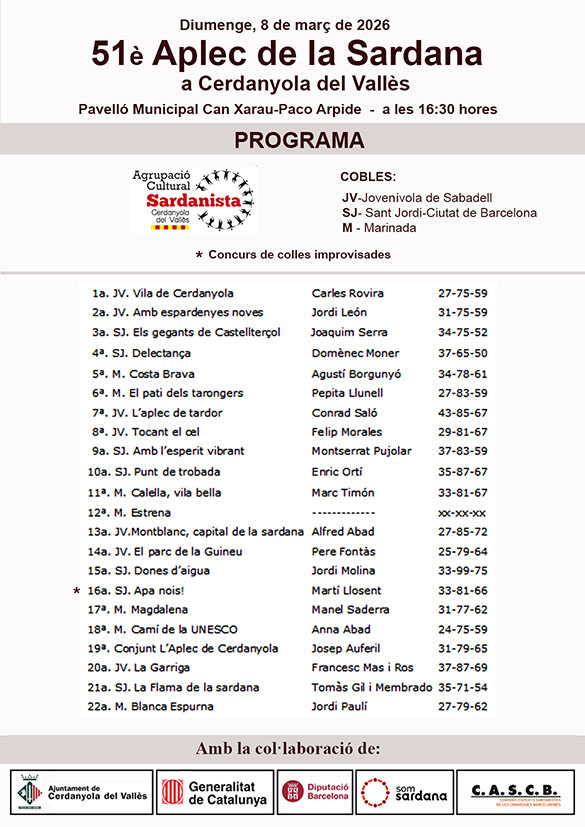 Cartell 51è Aplec de la SardanaPrograma 51è Aplec de la SardanaCartell Concert La SelvatanaCalendari ballades Agrupació Sardanista de Cerdanyola
