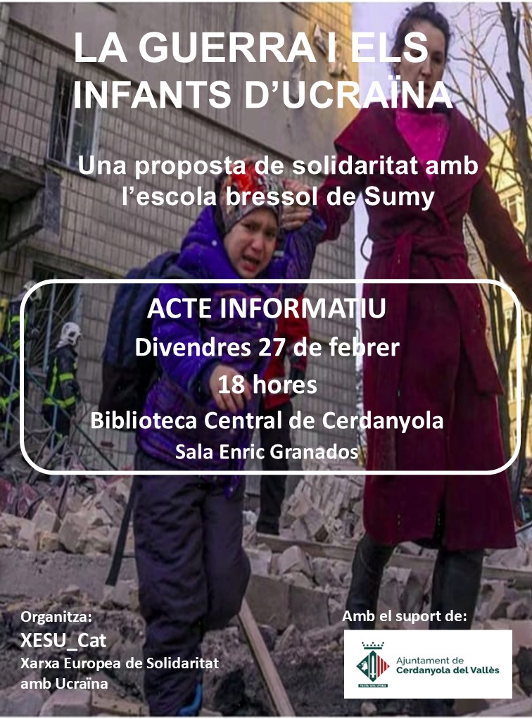 L’entitat XESU - Xarxa Europea de Solidaritat amb Ucraïna, en col·laboració de l’Ajuntament de Cerdanyola, organitza un acte informatiu per donar a conèixer la situació que pateixen els infants d’Ucraïna a conseqüència del conflicte bèl·lic.