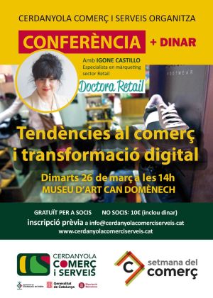 A Cerdanyola del Vallès, s'organitza la conferència "Tendències al Comerç i transformació digital", a càrrec d'Igone Castillo, especialista en Màrqueting digital sector Retail. Activitat gratuïta per socis, els no socis 10€. Cal inscripció prèvia a @ccamcat