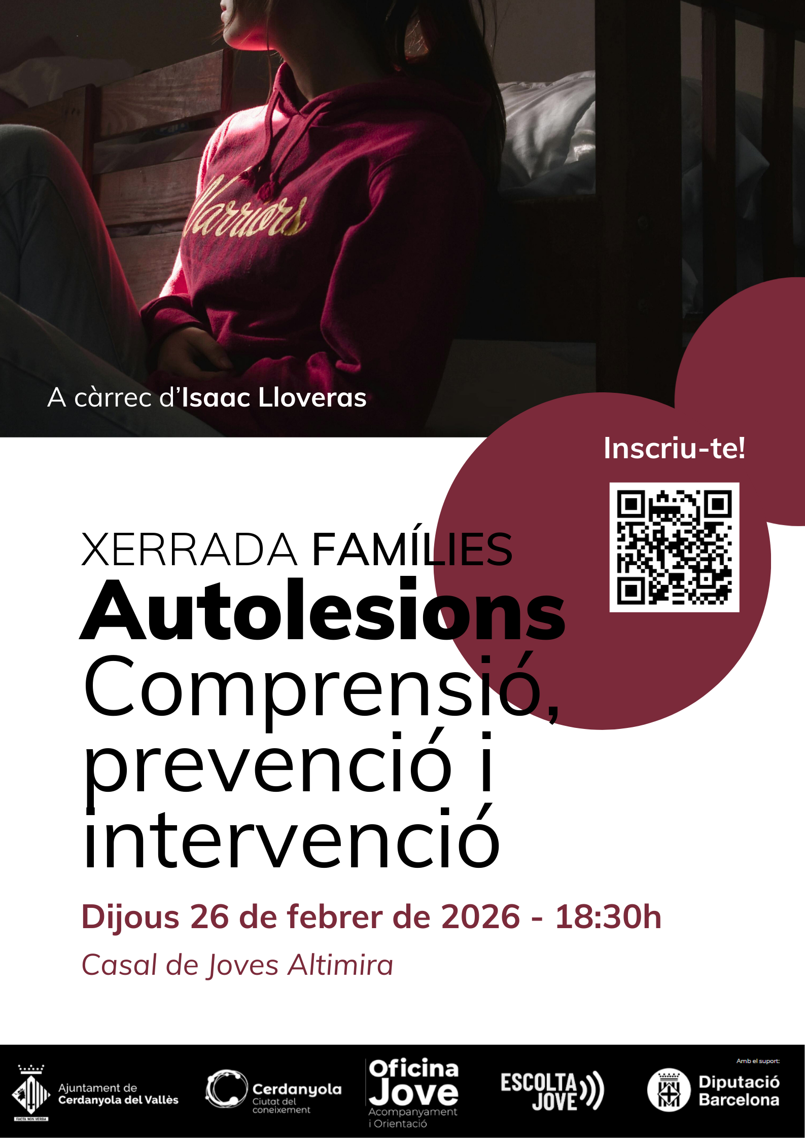 La sessió per a famílies i/o professionals sobre AUTOLESIONS, és un espai per entendre què són les autolesions i per què poden aparèixer, quins senyals d’alerta cal tenir en compte i com prevenir-les des de l’àmbit familiar. També es donaran orientacions per acompanyar els fills i filles amb empatia, afavorint la comunicació i la confiança.