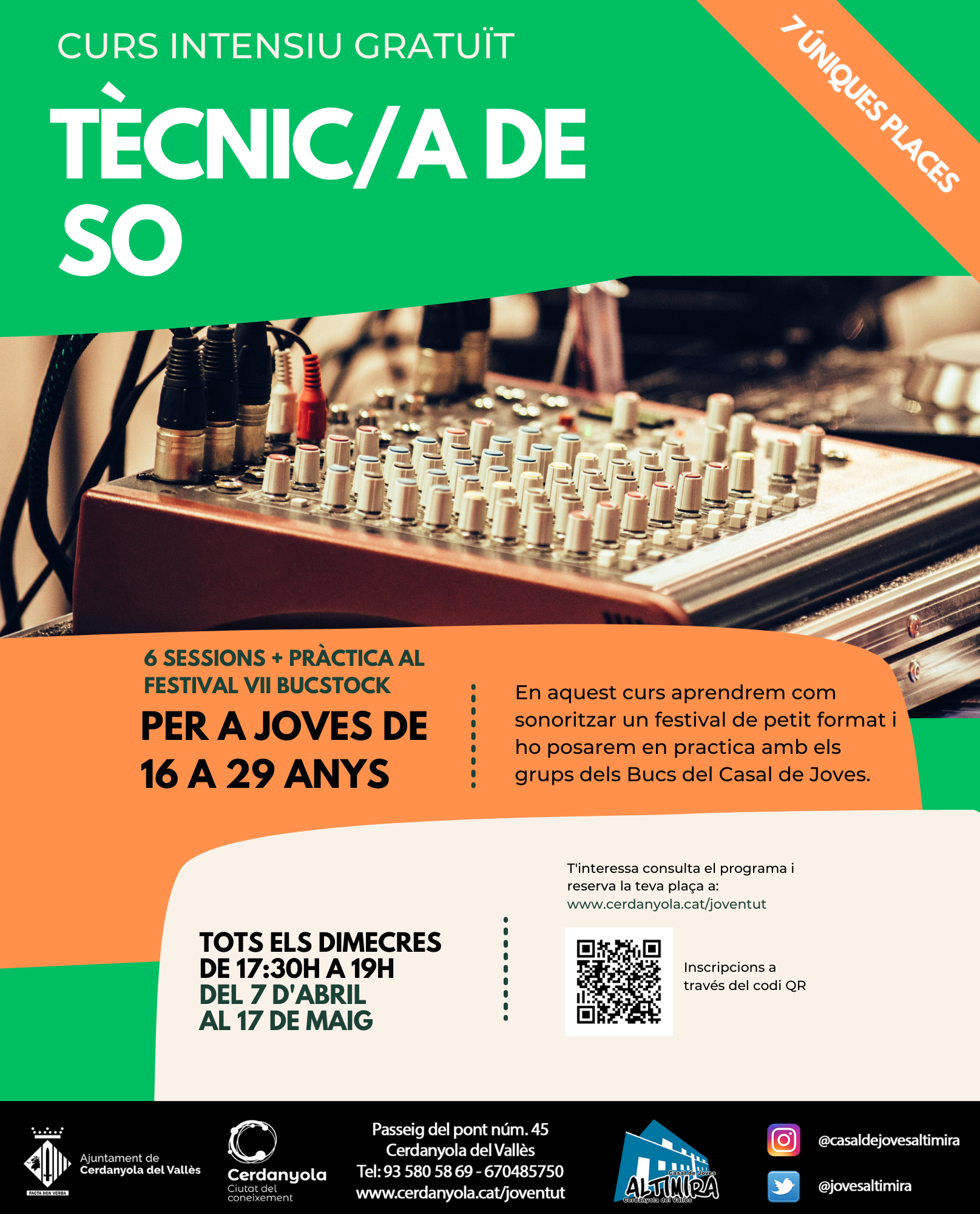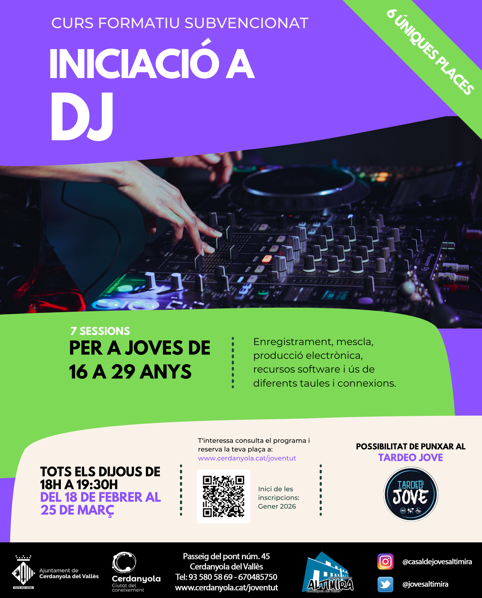 El curs consta de 3 mòduls amb un total de 7 sessions els dijous de 18 h a 19:30 h l'alumnat que completi el curs amb èxit podrà punxar al festival Bucstock del Casal de Joves o al Tardeo Jove de l'Ajuntament de Cerdanyola per a joves de 13 a 17 anys, treball remunerat.