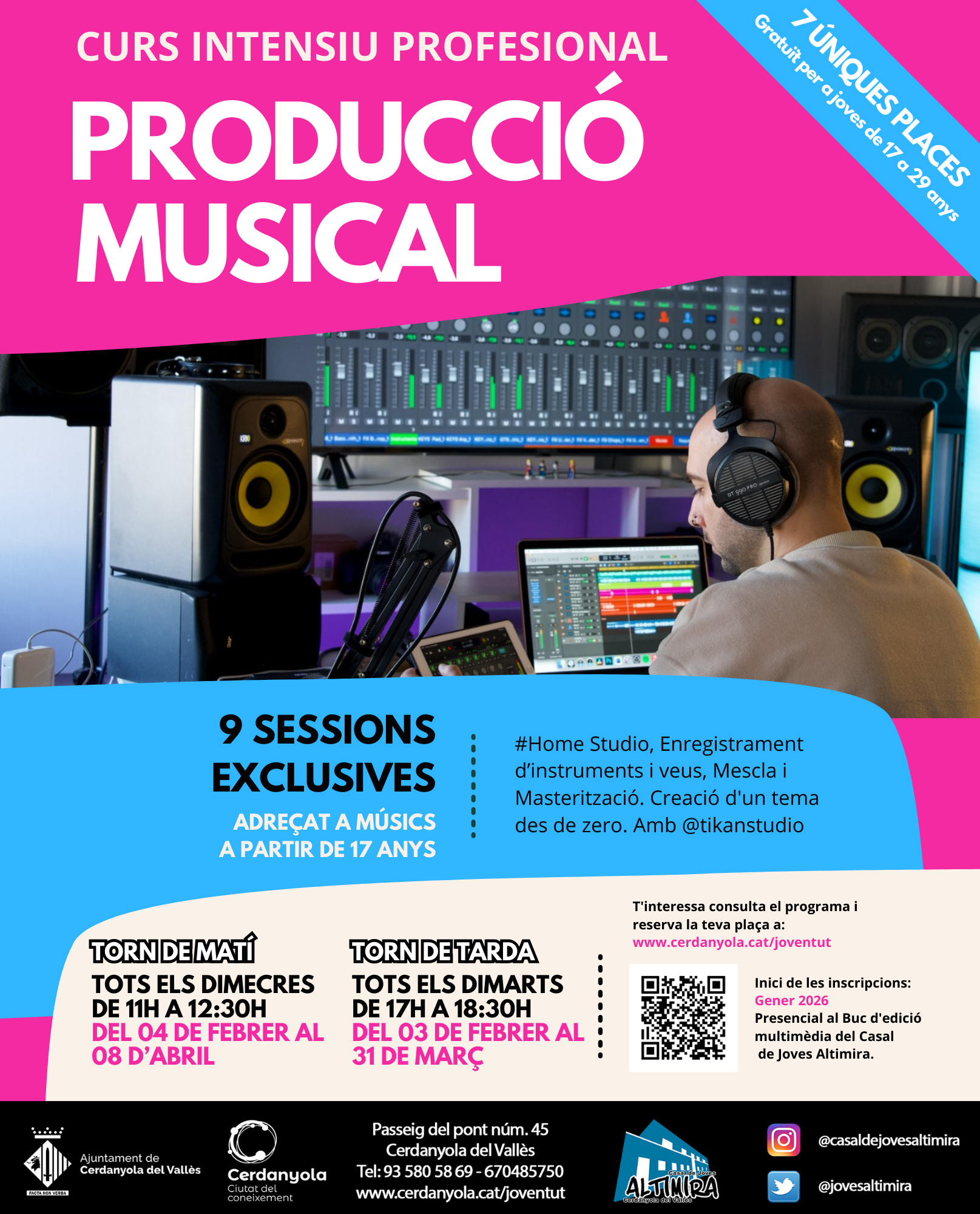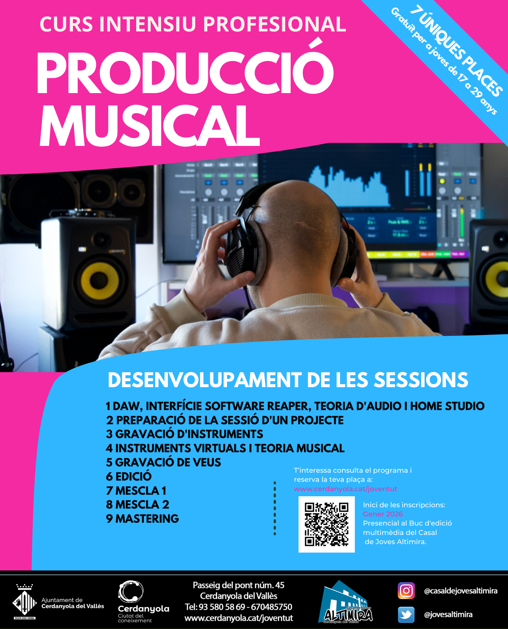 En aquest curs s'aprendran totes les fases de la realització d'una cançó de forma cronològica, des de la producció instrumental, passant per l'enregistrament d'instruments i veus, fins a la fase de postproducció on farem la mescla i el màster a punt per distribuir el nou tema a les plataformes digitals.