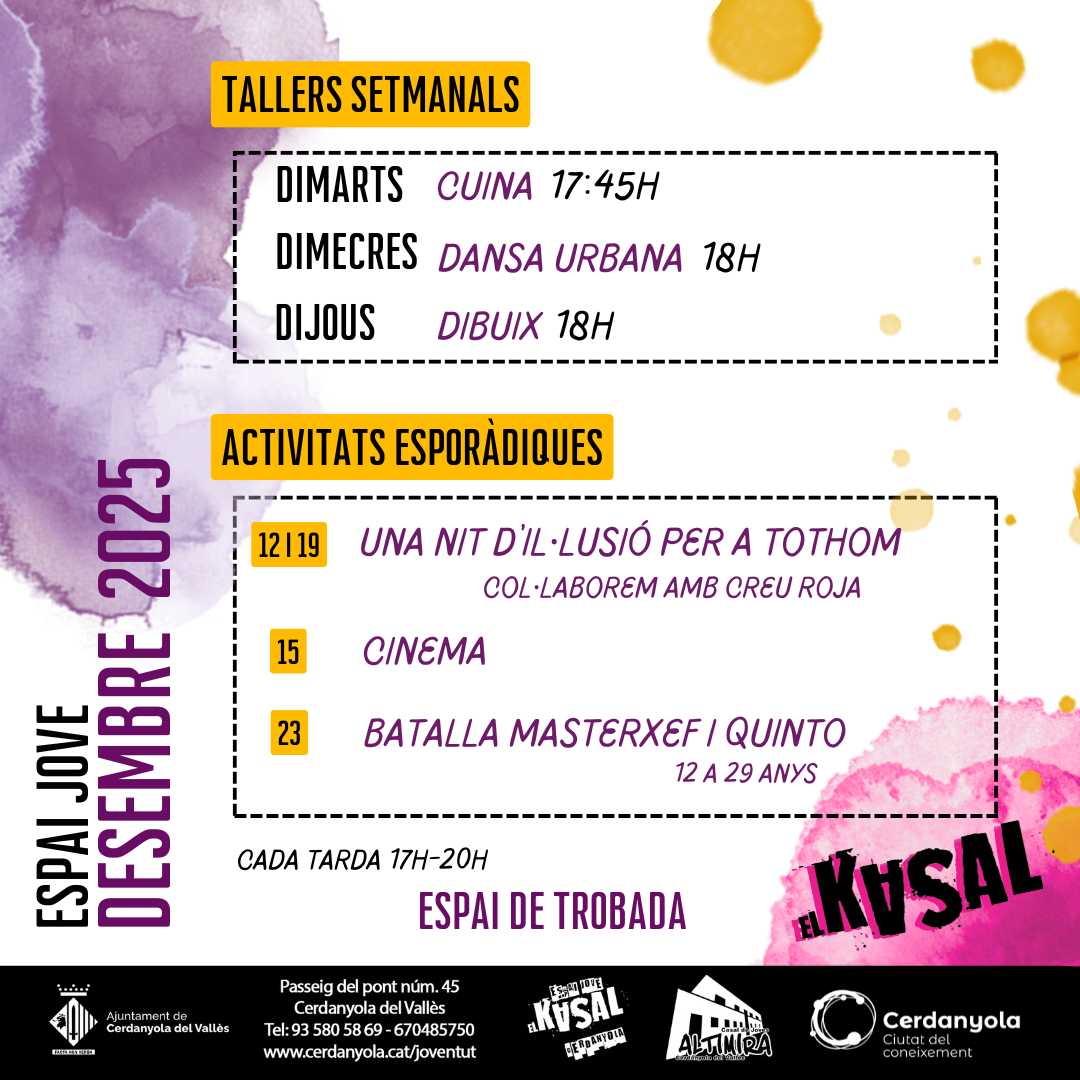 A més, s’organitzen tallers setmanals amb una programació trimestral en què els joves participen en la seva creació. Hi ha moltes opcions adaptades als interessos del grup. Consulta la programació mensual per veure totes les activitats disponibles.